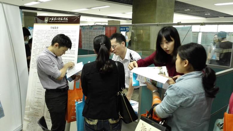 此次“高校与用人单位2015届毕业生供需对接会”旨在促进高校与企业之间更加深入的沟通了解,加大校企合作力度,建立2015届毕业生就业供需平台。共有南京及周边地区近500家企业和科研院所人力资源部门的负责人上会与高校对接。在对接会上,我院设立了单独的摆设展位,发放宣传资料,接受用人单位的咨询,并受到用人单位代表高度关注,尤其有很多所与教育行业相关的单位前来咨询洽谈。
